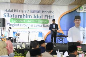 KOTA BANDUNG – Pemerintah Daerah Provinsi (Pemdaprov) Jawa Barat menggelar Halal Bil Halal dan Silahturahim Hari Raya Idul Fitri 1440 Hijriah bersama seluruh unsur Forkopimda, OPD, dan Bupati/Walikota se-Jawa Barat di area Parkir Barat Gedung Sate, Kota Bandung, Selasa (11/6/2019).