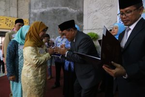 CIREBON- Penghargaan Satyalancana Karya Satya Presiden Republik Indonesia diberikan langsung oleh Wali Kota Cirebon, Drs. Nasrudin Azis, SH yang didampingi oleh Sekretaris Daerah Kota Cirebon, Drs. Asep Dedi, M.Si dan Kepala BK-Diklat Kota Cirebon, Anwar Sanusi kepada 410 Orang Pegawai Negeri Sipil (PNS) di Gedung Islamic Center Kota Cirebon, Rabu (29/11).