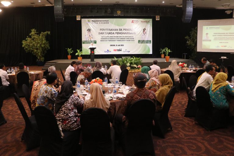 CIREBON – Wakil Wali Kota Cirebon, Dra. Hj. Eti Herawati menyerahkan SK pensiun dan tanda penghargaan kepada Aparatur Sipil Negara (ASN) di lingkungan Pemerintah Daerah (Pemda) Kota Cirebon yang akan memasuki masa purnabakti triwulan IV tahun 2023, Rabu (26/7/2023), di…