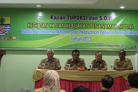 (11/11) Wahidin, Hotel Zambrud. Wakil Walikota Cirebon Drs. Nasrudin Azis, SH., hadir dalam kegiatan Kajian Tupoksi dan S.O.P yang diselenggarakan oleh Badan Penanaman Modal dan Pelayanan Perijinan Kota Cirebon, kegiatan ini di ikuti oleh unsur internal BPMPP Kota Cirebon serta OPD terkait yang di tunjuk berjumblah 45 orang, dalam sambutannya Wakil Walikota menyampaikan dengan di selenggarakannya kegiatan kajian Tupoksi dan S.O.P Badan Penanaman Modal dan Pelayanan Perijinan Kota Cirebon, dapat menghasilkan uraian tupoksi dan penyusunan standar oprasional prosedur yang baik, yang akan mendukung pada kinerja BPMPP Kota Cirebon sebagai etalase potensi investasi dan pembangunan ekonomi di Kota Cirebon, yang mampu memberikan pelayanan kepada masyarakat secara Prima, cepat dan transpara.