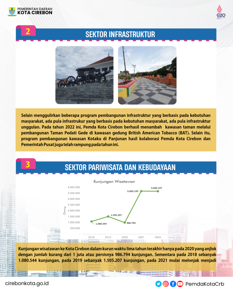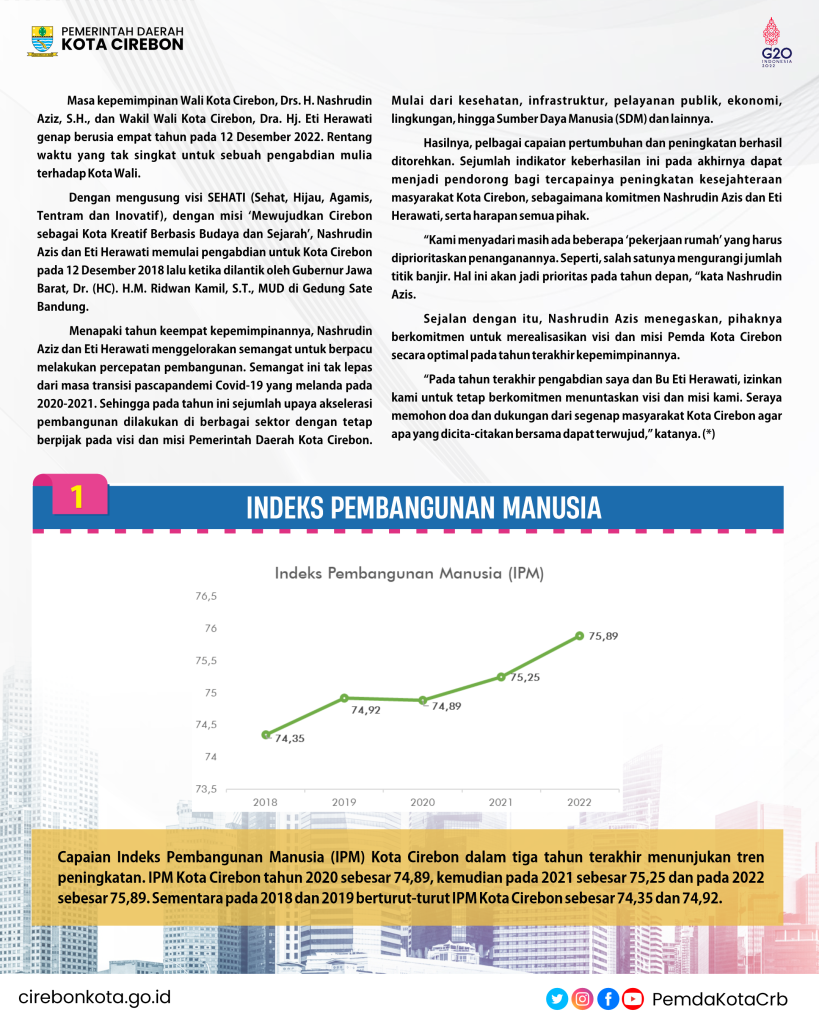 Menapaki tahun keempat kepemimpinannya, Nashrudin Azis dan Eti Herawati menggelorakan semangat untuk berpacu melakukan percepatan pembangunan. Semangat ini tak lepas dari masa transisi pascapandemi Covid-19 yang melanda pada 2020-2021. Sehingga pada tahun ini sejumlah upaya akselerasi pembangunan dilakukan di berbagai sektor dengan tetap berpijak pada visi dan misi Pemerintah Daerah Kota Cirebon. Mulai dari kesehatan, infrastruktur, pelayanan publik, ekonomi, lingkungan, hingga Sumber Daya Manusia (SDM) dan lainnya.