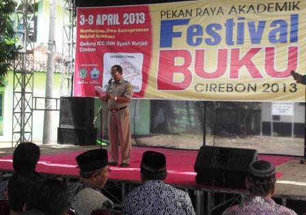 Staf Ahli Walikota Cirebon Bidang Ekonomi & Pembangunan Drs. Atang Hasan M.Si. membaca Sambutan Walikota Cirebon pada acara Pembukaan Festival Buku Cirebon 2013 di Gedung ICC Komplek IAIN Cirebon Rabu, (3/4).