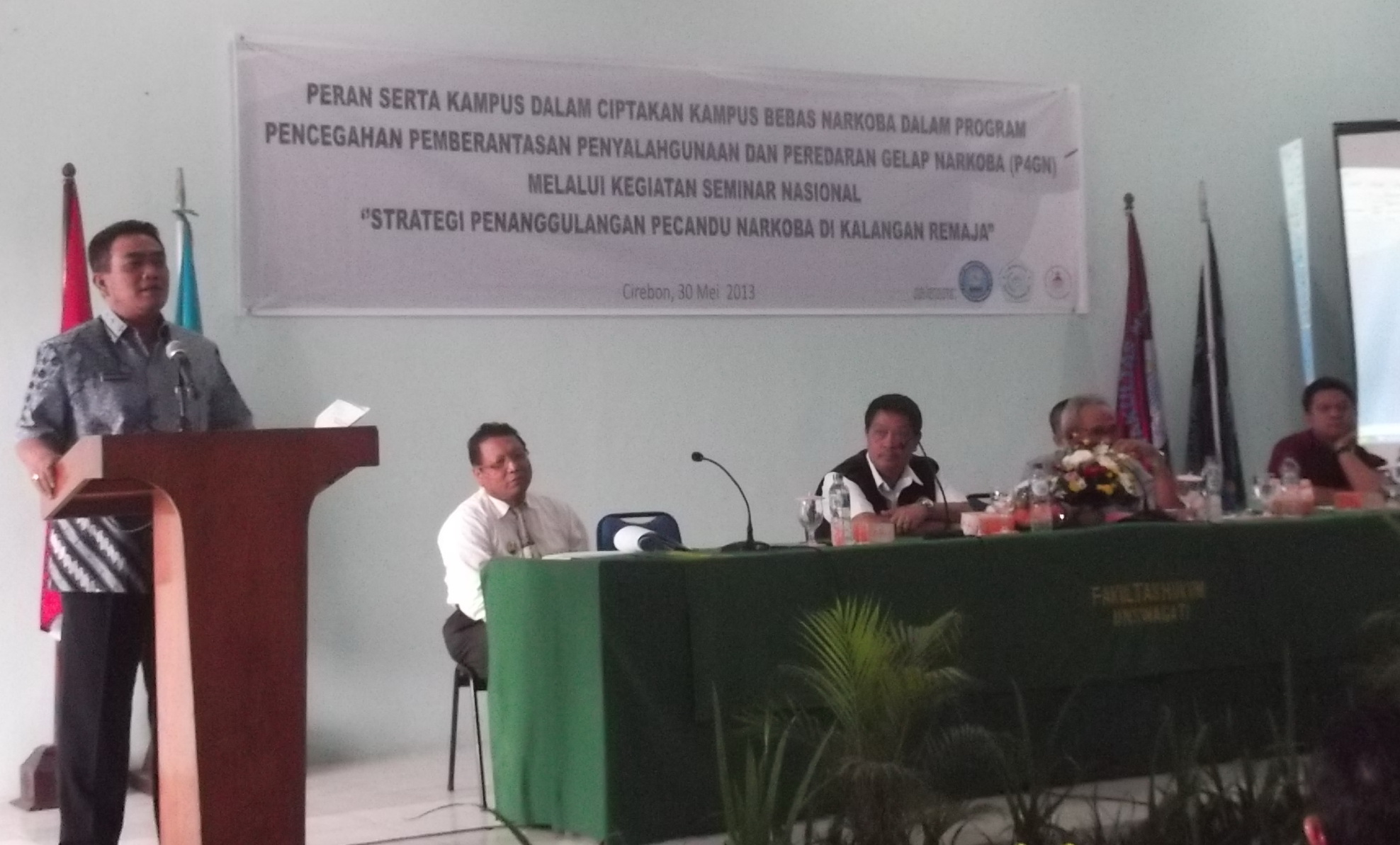 Kegiatan seminar Strategi penanggulangan pecandu narkoba di kalangan remaja sebagai nara sumber : Wakil Walikota Cirebon Drs. Nasrudin Azis, SH., Kepala BNN Profinsi Jawa Barat Brigjen Polisi Drs. Anang Pratanto, Praktisi Hukum Abdi Yuhana, SH. MH. Direktur Pasca Sarjana Unswagati Cirebon Dr. H. Djunaedi, SH. MH., serta AKP Hartono Kasat Serse Polresta Kota Cirebon.