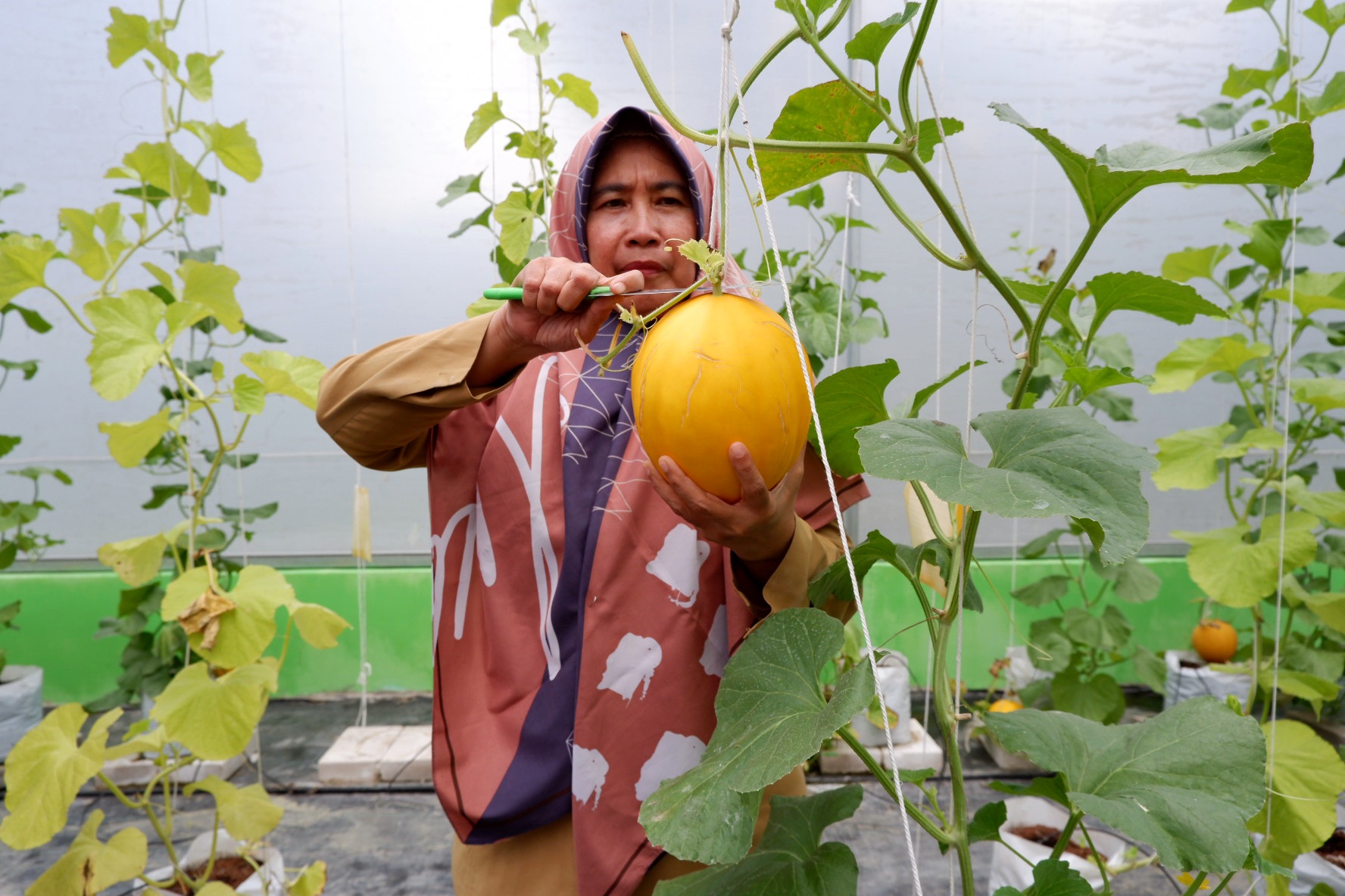 “Untuk tanaman melon bisa dipanen dalam kurun waktu dua sampai dua setengah bulan,” tutur Yati. Satu tanaman bisa tiga kali panen dan diupayakan satu pohon satu buah supaya hasilnya maksimal.