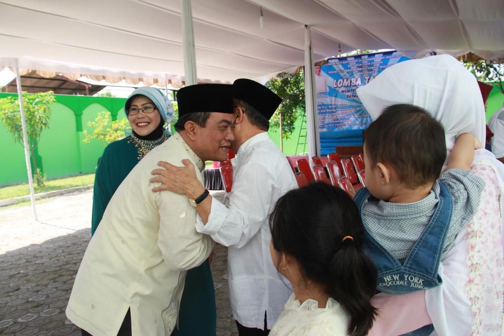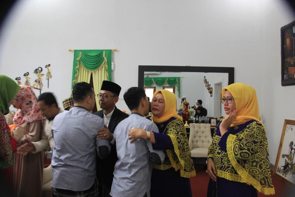 Isak tangis mewarnai acara salam-salaman antar sesama anggota keluarga Wali Kota Cirebon Ano Sutrisno dan istri Erni Astuti Ano Sutrisno saat hari Raya Idul Fitri 1436 Hijriyah, Minggu (28/7/2014). Suasana haru begitu terasa saat seluruh sanak famili bermaaf-maafan satu dengan yang lainnya. Pelukan dan permintaan maaf seolah menghapus kesalahan yang pernah dibuat.