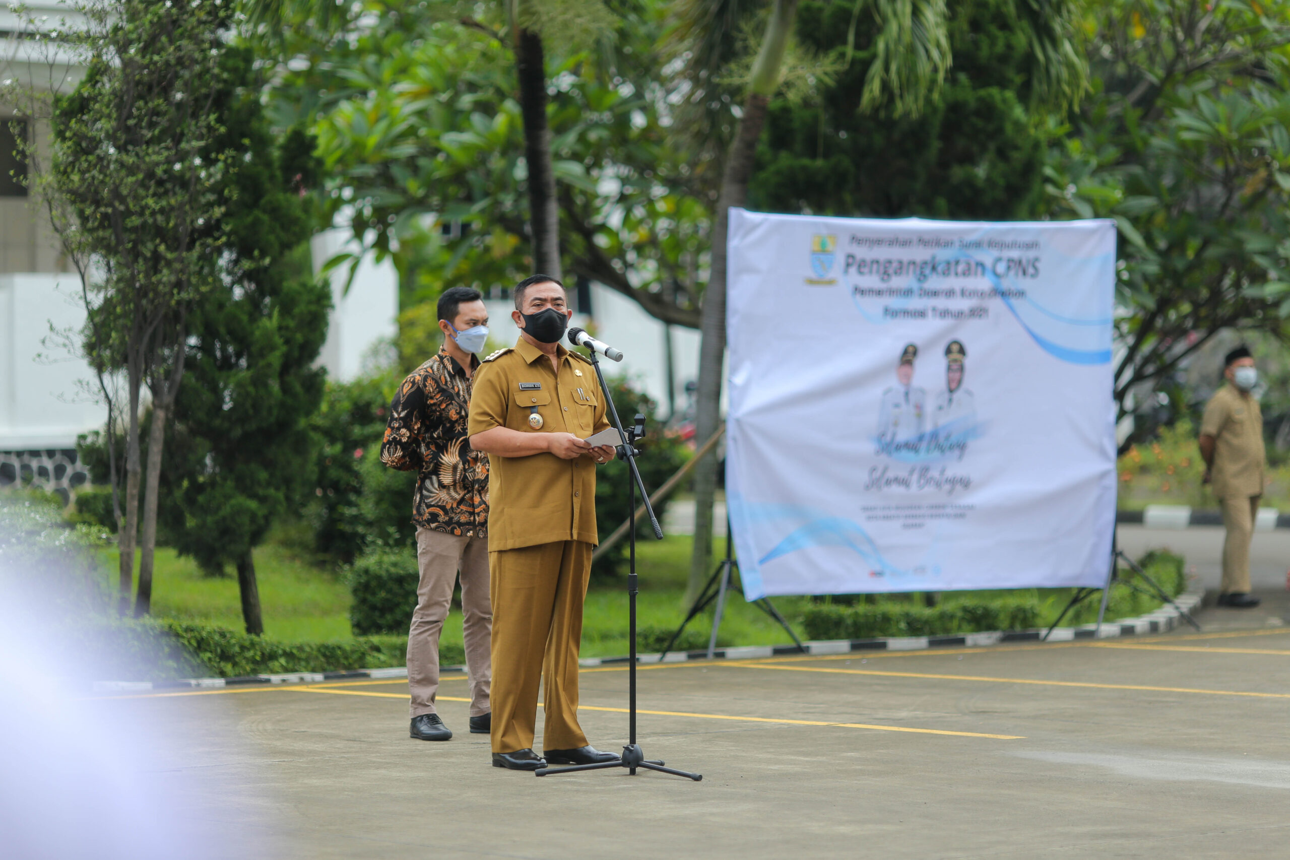 CIREBON - Wali Kota Cirebon, Drs. H. Nashrudin Azis, S.H., menyerahkan petikan surat keputusan (SK) pengangkatan Calon Pegawai Negeri Sipil (CPNS) kepada 100 orang, Selasa (22/3/2022), di lapangan upacara Balai Kota Cirebon.