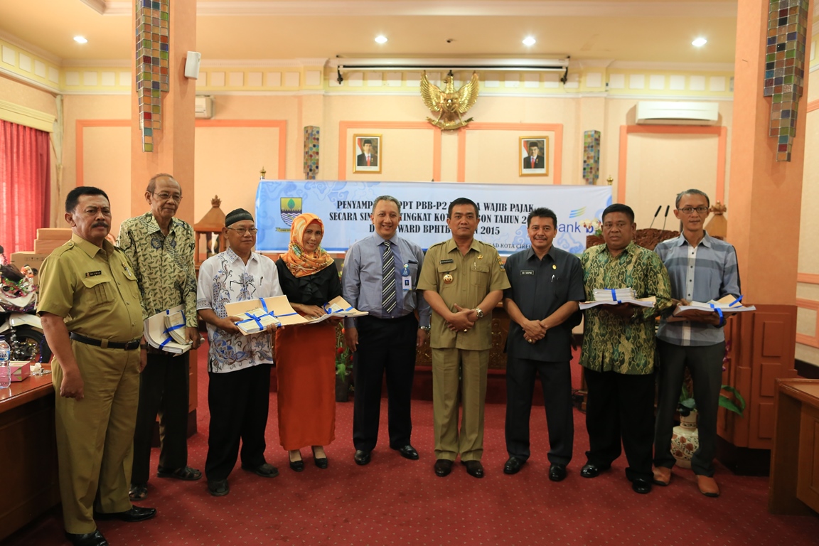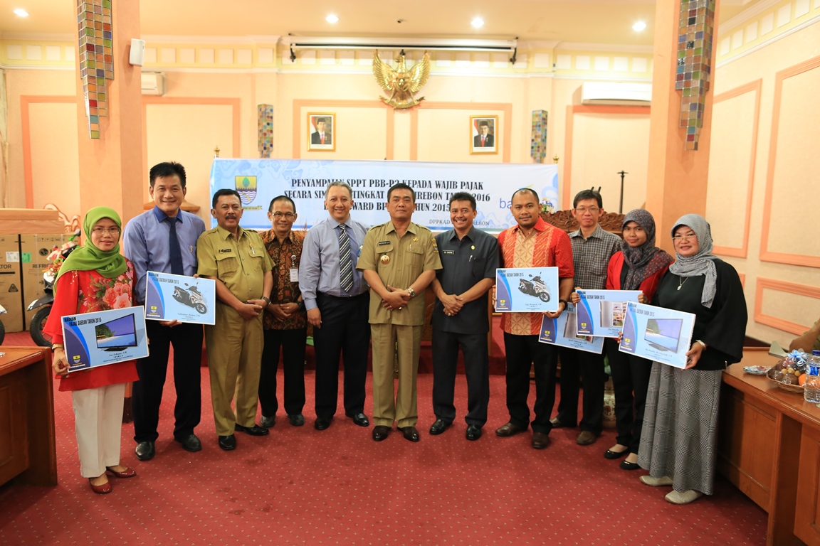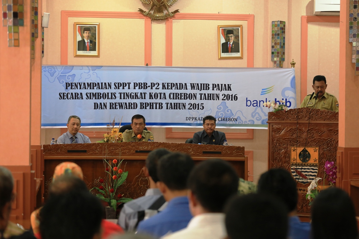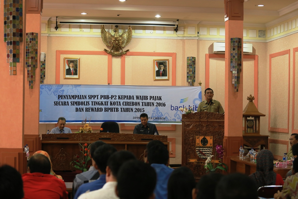 Kota Cirebon, Rabu (20/01/2016) DPPKAD menggelar kegiatan Penyerahan Surat Pemberitahuan Pajak Terhutang (SPPT) , Pajak Bumi dan Bangunan Sektor Perdesaan dan Perkotaan (PBB P2) Tahun 2016 di Ruang Adipura Balaikota Jl. Siliwangi No.84 Kota Cirebon. Hadir dalam kegiatan ini Walikota Cirebon Drs Nasrudin Azis SH, Pimpinan serta Anggota DPRD, Forum Koordinasi Pimpinan Daerah (FKPD) Pimpinan Bank Jabar Banten cabang Cirebon, Sekda Kota Cirebon, Kepala Kantor Pelayanan Pajak Pratama Cirebon, Kepala DPPKAD, para Kepala OPD di lingkungan Pemerintah Kota Cirebon, serta para perwakilan ketua RW se-Kota Cirebon.