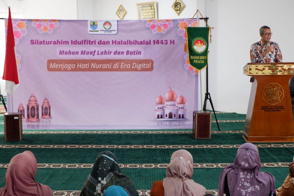 Sementara itu, Ketua DWP Kota Cirebon, Hj. NR. Madyawati A. Mulyadi, S.H., menjelaskan tema halal bihalal 1443 H kali ini yaitu menjaga hati nurani di era digital.