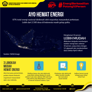 Penyediaan listrik secara merata dengan harga yang terjangkau sangat penting. Namun, melaksanakan penghematan energi juga tidak kalah penting. Di mulai tahun 2016 lalu, Kementerian Energi dan Sumber Daya Mineral (ESDM) menginisisasi gerakan hemat energi “Potong 10%”. Gerakan ini merupakan aksi bersama melibatkan Pemerintah, pelaku bisnis/industri, organisasi masyarakat sipil dan individu untuk melakukan penghematan energi sebesar 10%. Gerakan ini dilatarbelakangi pesatnya pertumbuhan konsumsi energi di tengah penurunan jumlah cadangan energi fosil yang saat ini masih menjadi sumber utama energi listrik di Indonesia.