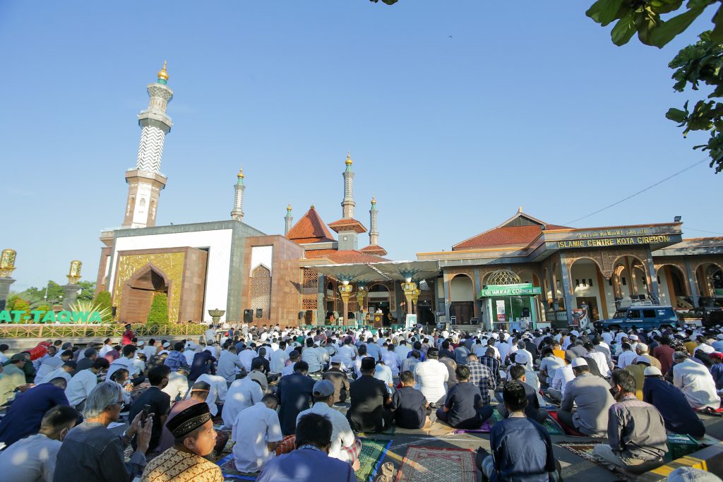 CIREBON – Ribuan umat muslim menunaikan salat Iduladha 1443 H dengan khusyuk di pelataran Masjid Raya At-Taqwa hingga kawasan Alun-alun Kejaksan Kota Cirebon, Minggu (10/7/2022).