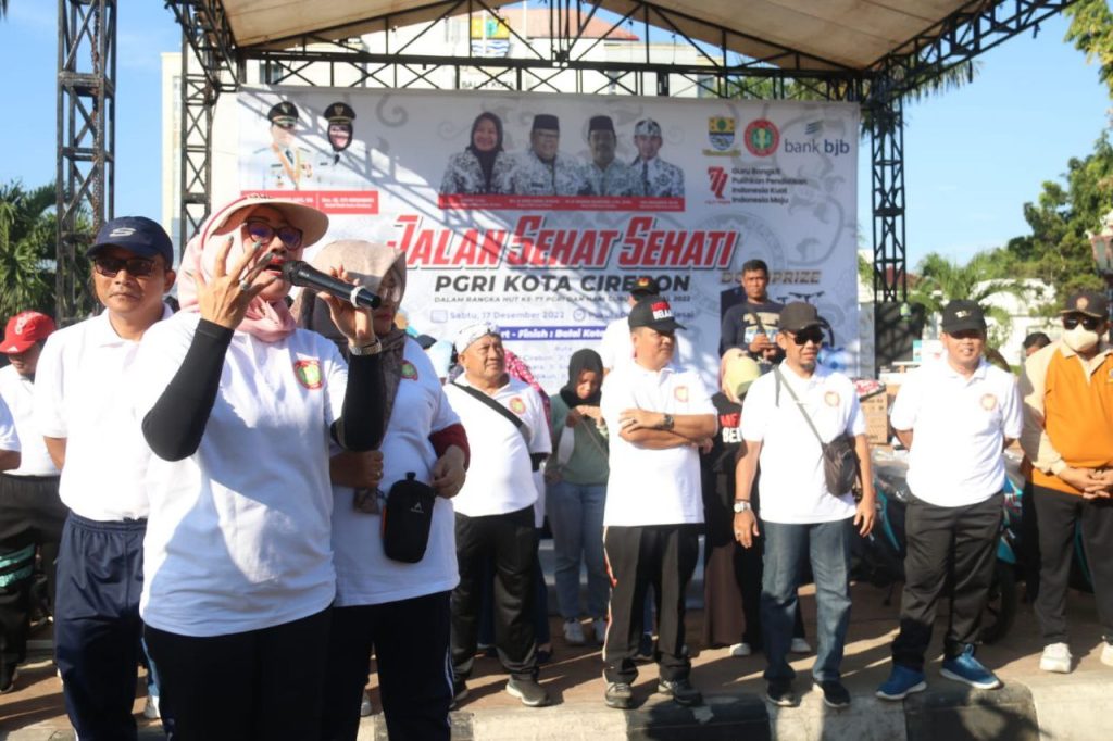 CIREBON – Jalan Sehat ‘Sehati’ yang diikuti anggota Persatuan Guru Republik Indonesia (PGRI) Kota Cirebon pada Sabtu (17/12/2022), berlangsung semarak. Jalan Sehat ‘Sehati’ merupakan puncak dari HUT ke-77 PGRI dan memperingati Hari Guru Nasional.
