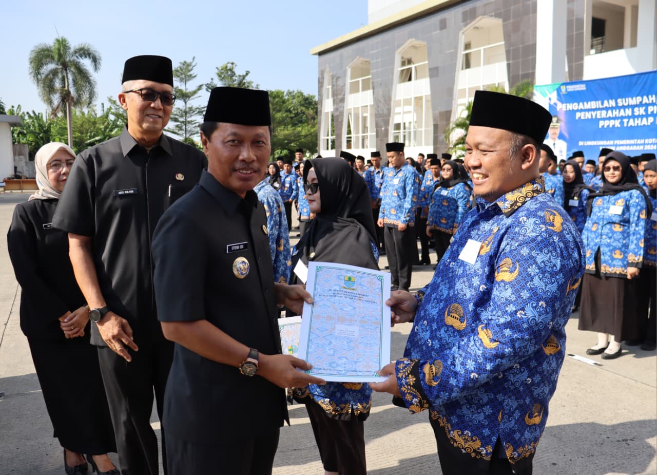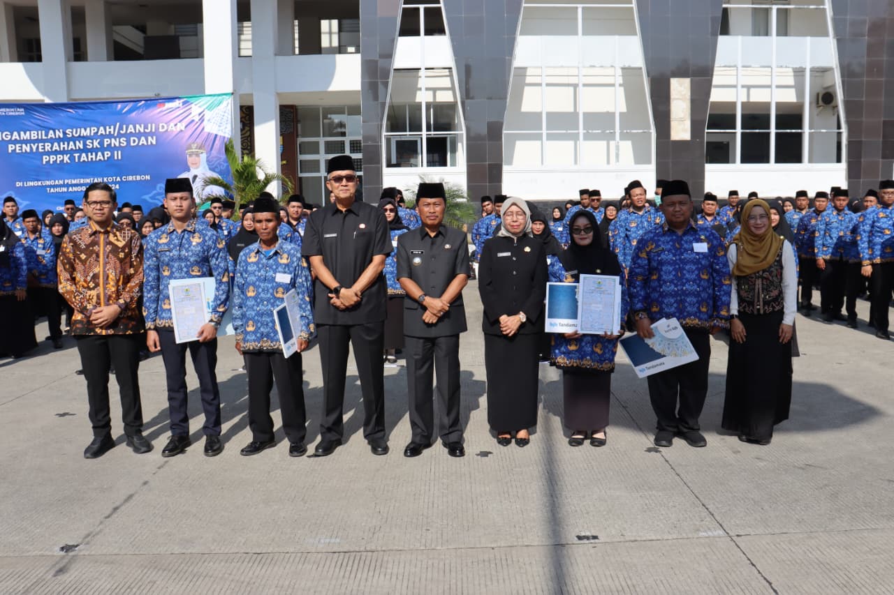Cirebon – Wali Kota Cirebon, Effendi Edo didampingi Sekretaris Daerah Kota Cirebon, Agus Mulyadi secara resmi melantik dan menyerahkan Surat Keputusan (SK) kepada Pegawai Negeri Sipil (PNS) dan Pegawai Pemerintah dengan Perjanjian Kerja (PPPK) Tahap II Tahun Anggaran 2024 di lingkungan Pemerintah Kota Cirebon, Kamis (4/9/2025).