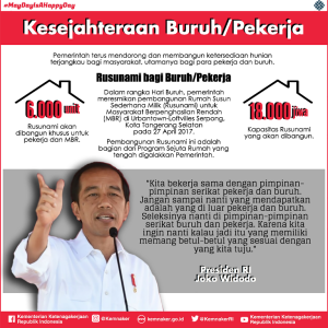 Ia melanjutkan, pemerintah terus berupaya meningkatkan kesejahteraan bagi pekerja dan buruh. Salah satu upayanya yaitu melalui program “Pembangunan Rusunami Masyarakat Berpenghasilan Rendah”. Jumat lalu Presiden Joko Widodo khusus datang meresmikan peletakan batu pertama program yang berkesinambungan dengan program pembangunan satu juta unit hunian dalam kurun waktu lima tahun.