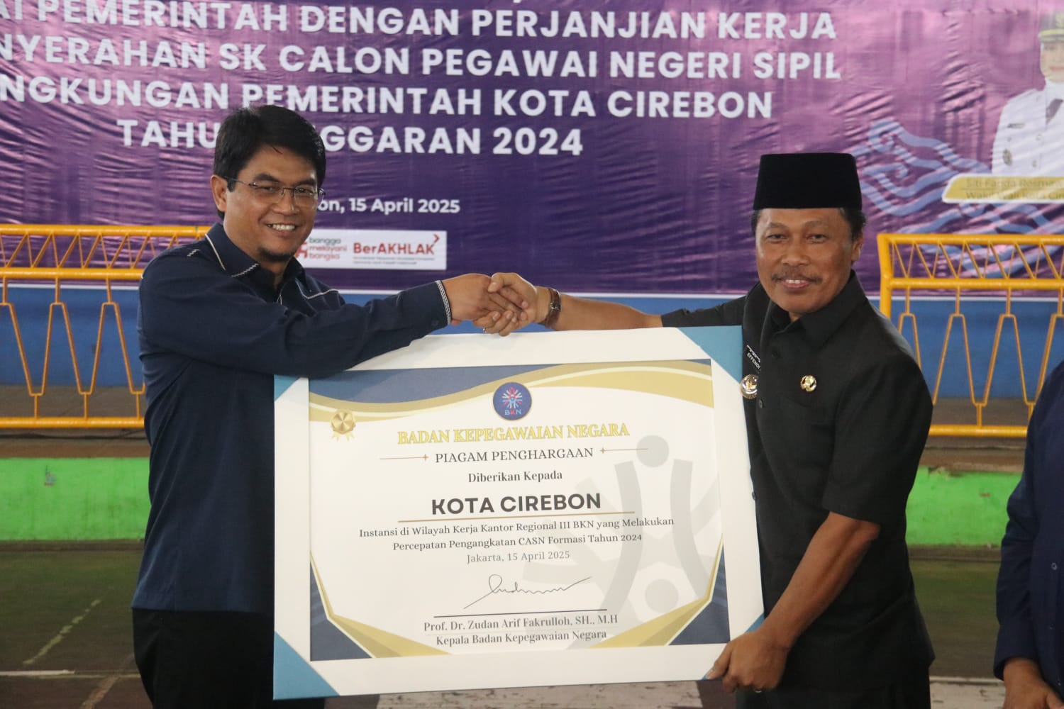 Dengan pengangkatan ini juga disampaikan piagam penghargaan dari BKN untuk Kota Cirebon sebagai instansi di wilayah Kerja Kantor Regional III BKN yang melakukan percepatan pengangkatan CASN formasi tahun 2024.