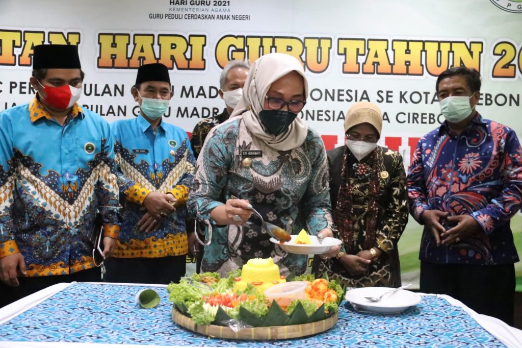 Wakil Wali Kota Cirebon, Dra. Hj. Eti Herawati usai menghadiri peringatan Hari Guru Tahun 2021 sekaligus pelantikan DPC Perkumpulan Guru Madrasah Indonesia se Kota Cirebon sekaligus seminar pendidikan, di Kota Cirebon, Kamis (25/11/2021). “Selamat hari guru untuk semua guru. Termasuk guru madrasah,” tutur Eti.