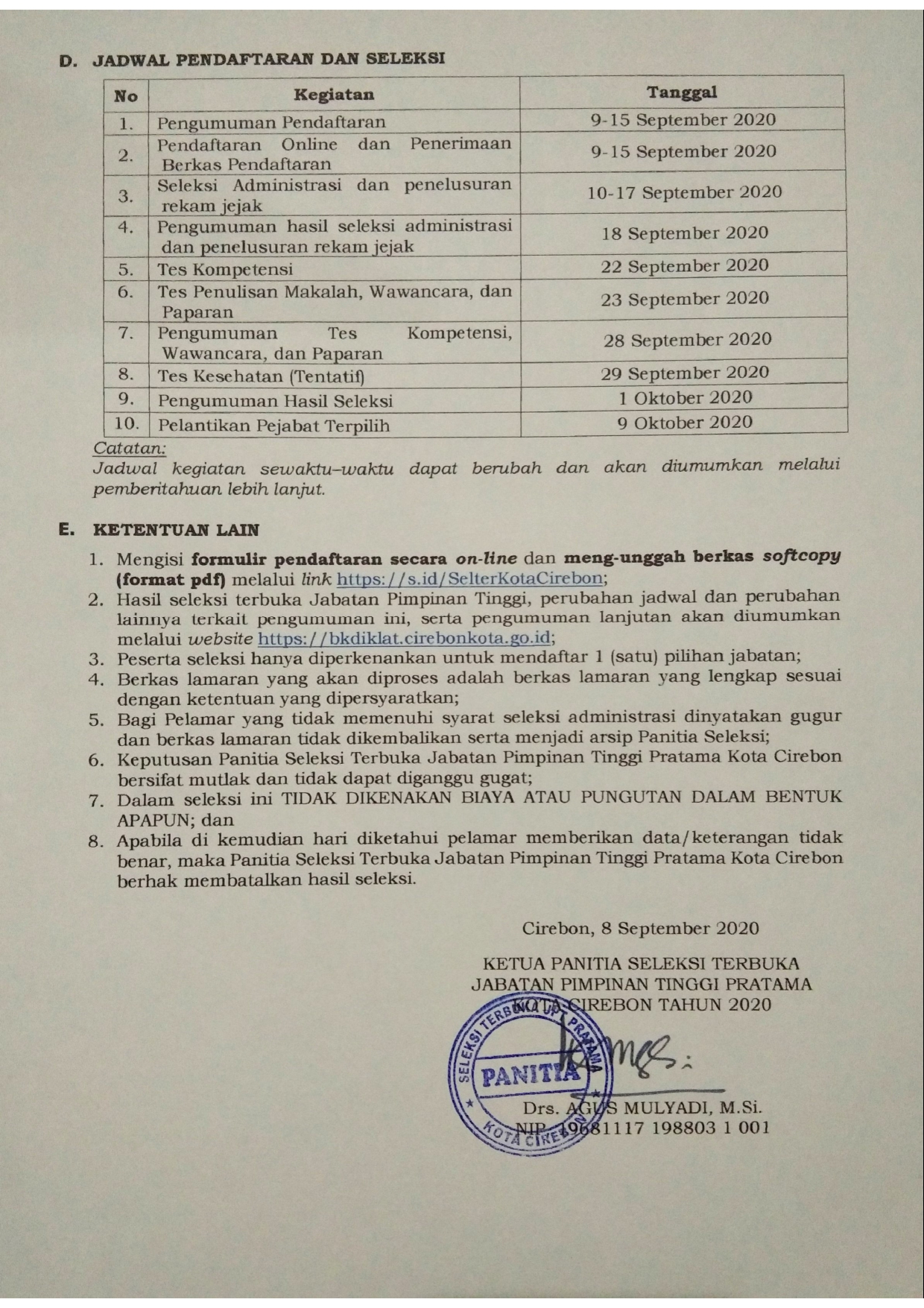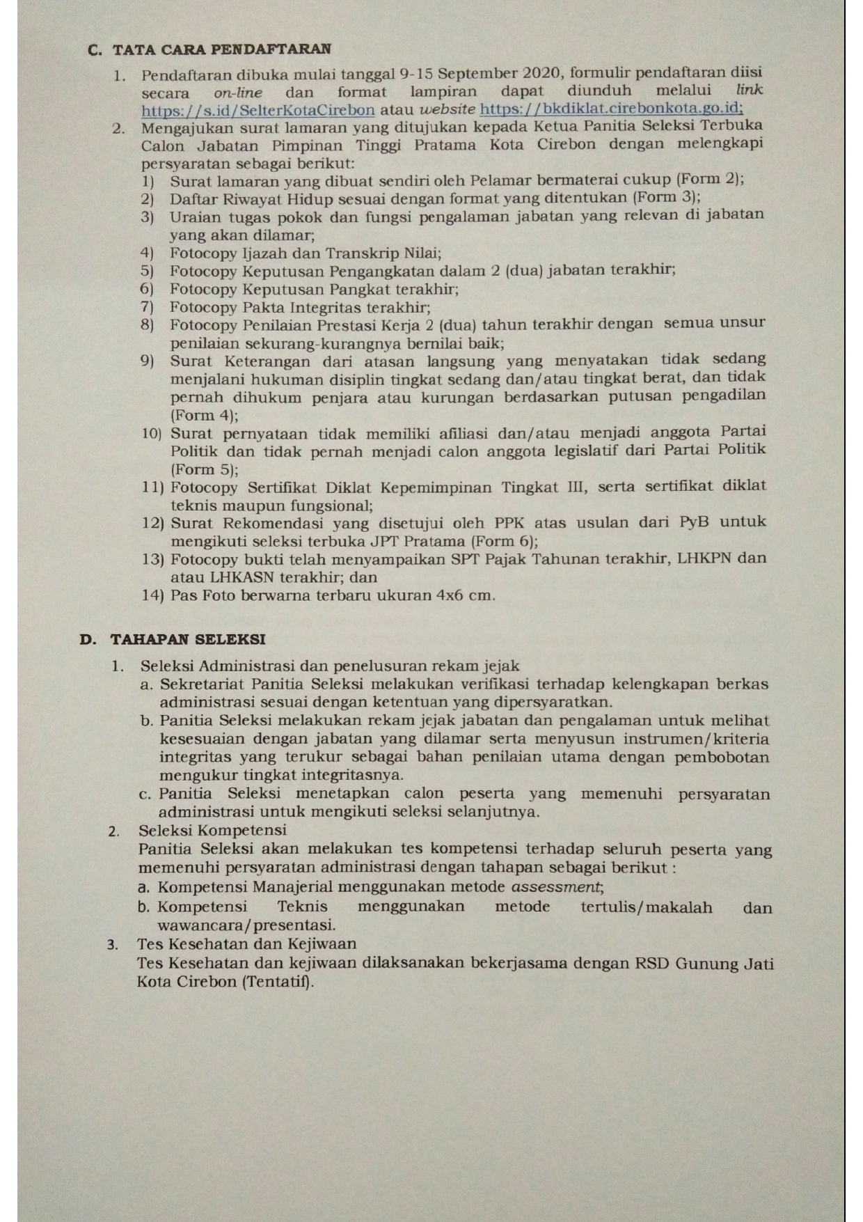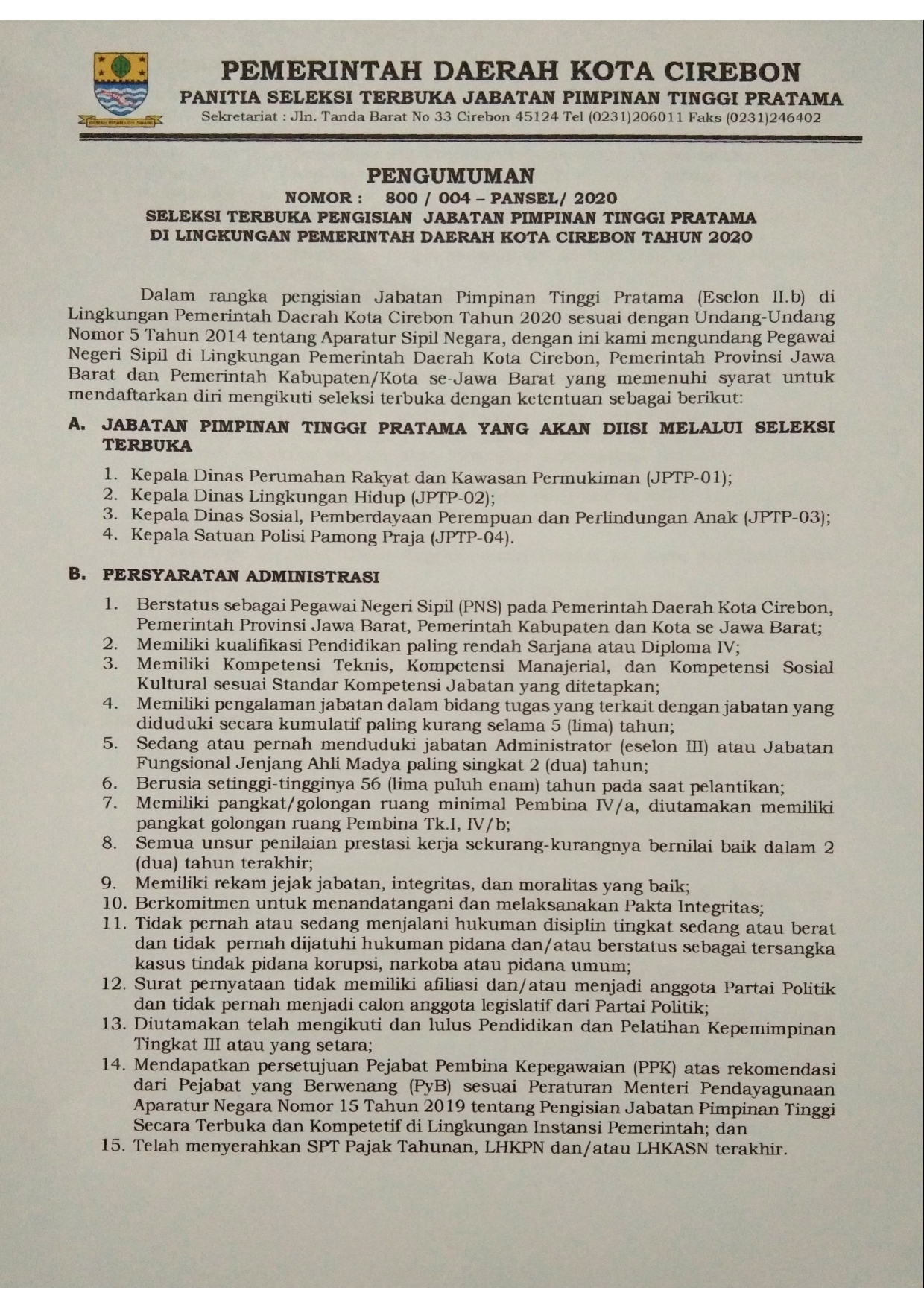 Pengumuman Seleksi Terbuka Pengisian Jabatan Pimpinan Tinggi Pratama Di Lingkungan Pemerintah Daerah Kota Cirebon Tahun 2020