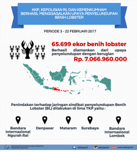 Penindakan terhadap jaringan sindikat penyelundupan Benih Lobster (BL) dilakukan di lima TKP yaitu di wilayah Denpasar, Bandara Internasional Ngurah Rai Denpasar, Bandara Internasional Lombok, Kota Mataram , Surabaya selama periode 3 Februari s/d 22 Februari 2017. Penggagalan penyelundupan BL tersebut merupakan hasil kerjasama operasi antara Dit. Tipidter Bareskrim Polri, BKIPM Denpasar, BKIPM Mataram, dan Imigrasi Bandara Ngurah Rai Denpasar.