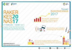 Salah satu upaya optimalisasi serta akselerasi hasil kerja dan kontribusi berbagai sektor dalam pelaksanaan program pembangunan kesehatan maka diselenggarakan forum komunikasi dan informasi antara stakeholders berbagai lintas sektor yang melibatkan lebih kurang 1.787 peserta baik di tingkat Pusat maupun Daerah, yaitu Rapat Kerja Kesehatan Nasional (Rakerkesnas) tahun 2017 yang mengusung tema “Integrasi Pusat dan Daerah dalam Pelaksanaan Pendekatan Keluarga untuk Mewujudkan Indonesia Sehat” yang dilaksanakan mulai 26 Februari 2017 s.d 1 Maret 2017 di Jakarta. Rakerkesnas 2017 yang merupakan media komunikasi dan interaksi antara pusat dan daerah dalam mensinergikan pelaksanaan pembangunan kesehatan, rencananya akan dibuka oleh Bapak Presiden Joko Widodo pada 28 Februari 2017 mendatang. Adapun rangkaian kegiatan Rakerkesnas 2017 adalah sebagai berikut: