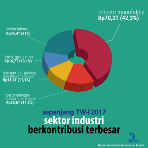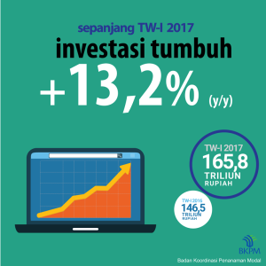 Selama Triwulan I 2017, realisasi penanaman modal dalam negeri (PMDN) sebesar Rp 68,8 Triliun, naik 36,4% dari Rp 50,4 triliun pada periode yang sama tahun 2016, dan penanaman modal asing (PMA) sebesar Rp 97,0 triliun, naik 0,94% dari Rp 96,1 triliun pada periode yang sama tahun 2016.