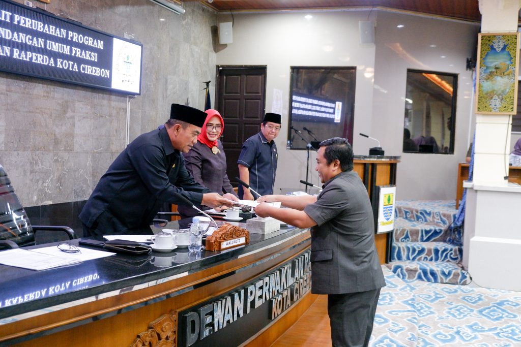 Dalam kesempatan yang sama, Azis juga menyampaikan tiga rancangan peraturan daerah (raperda), yakni Raperda tentang Penyelenggaraan Administrasi Kependudukan, Raperda tentang Perubahan atas Perda Nomor 12/2021 tentang Penyertaan Modal Daerah pada Perusahaan Umum Daerah (Perumda) Bank Pengkreditan Rakyat Bank Cirebon, serta Raperda tentang Rincian Urusan Pemerintah yang Diselenggarakan oleh Pemda Kota Cirebon.