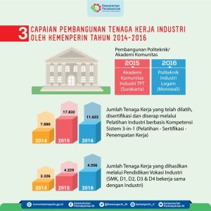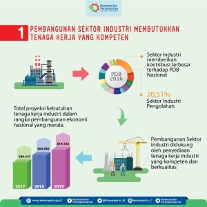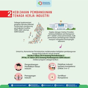 Pemerintah berkomitmen untuk memenuhi kebutuhan SDM Industri dengan memfokuskan pada penyiapan satu juta tenaga kerja industri tersertifikasi hingga tahun 2019. Sejalan dengan Instruksi Presiden Nomor 9 tahun 2016, Kementerian Perindustrian (Kemenperin) ditugaskan meningkatkan kerja sama dengan dunia usaha, untuk memberikan akses yang lebih luas bagi siswa SMK untuk melakukan praktek kerja lapangan dan magang industri bagi guru.