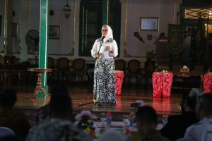 CIREBON—Wakil Wali Kota Cirebon Dra. Hj. Eti Herawati memaparkan berbagai program dan rencana pengembangan sektor pariwisata di Kota Cirebon saat mengikuti welcome dinner bersama travel agent se-Indonesia, Jumat (22/02/2019) di Keraton Kacirebonan.