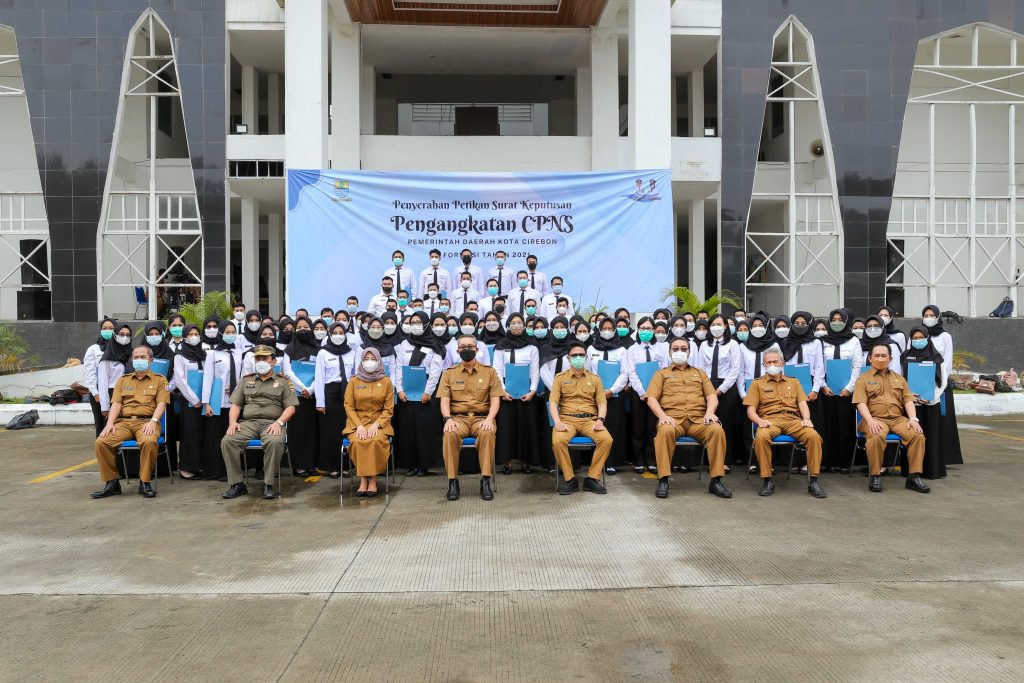 CIREBON – Wali Kota Cirebon, Drs. H. Nashrudin Azis, S.H., menyerahkan petikan surat keputusan (SK) pengangkatan Calon Pegawai Negeri Sipil (CPNS) kepada 100 orang, Selasa (22/3/2022), di lapangan upacara Balai Kota Cirebon.